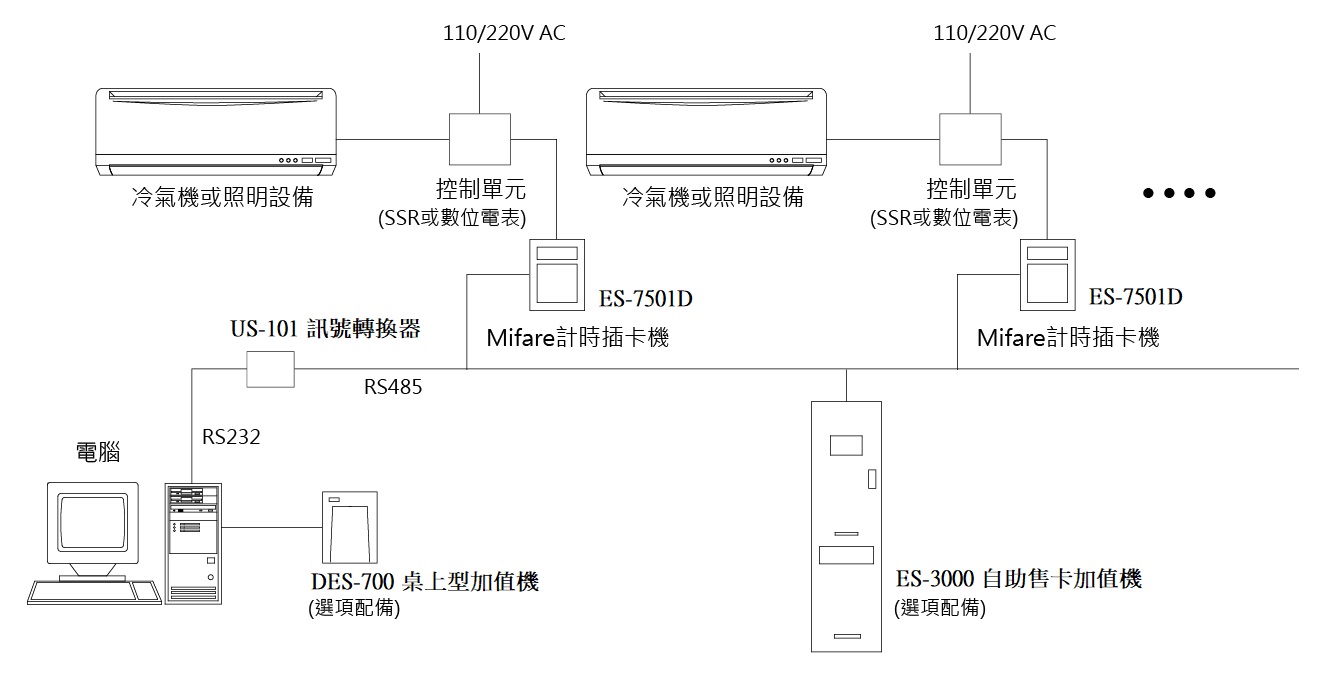 冷氣機增加設置一”控制單元”(電磁接觸器或電流量計數器)如架構圖,控制單元控制平常冷氣機無AC 220V電源,當學生持Mifare儲值卡,於ES-7501D計時插卡機插入讀卡時,卡機判讀卡片儲值,扣值後插卡機輸出Relay乾接點訊號,透過電磁接觸器啟動冷氣機動作,如計時插卡機每5分鐘設定扣一固定值,則插卡機於5分鐘後會再扣除一次值,如無法扣值成功,則計時插卡機Relay跳開,控制單元將斷電,冷氣機無AC220電源,將停止運轉。